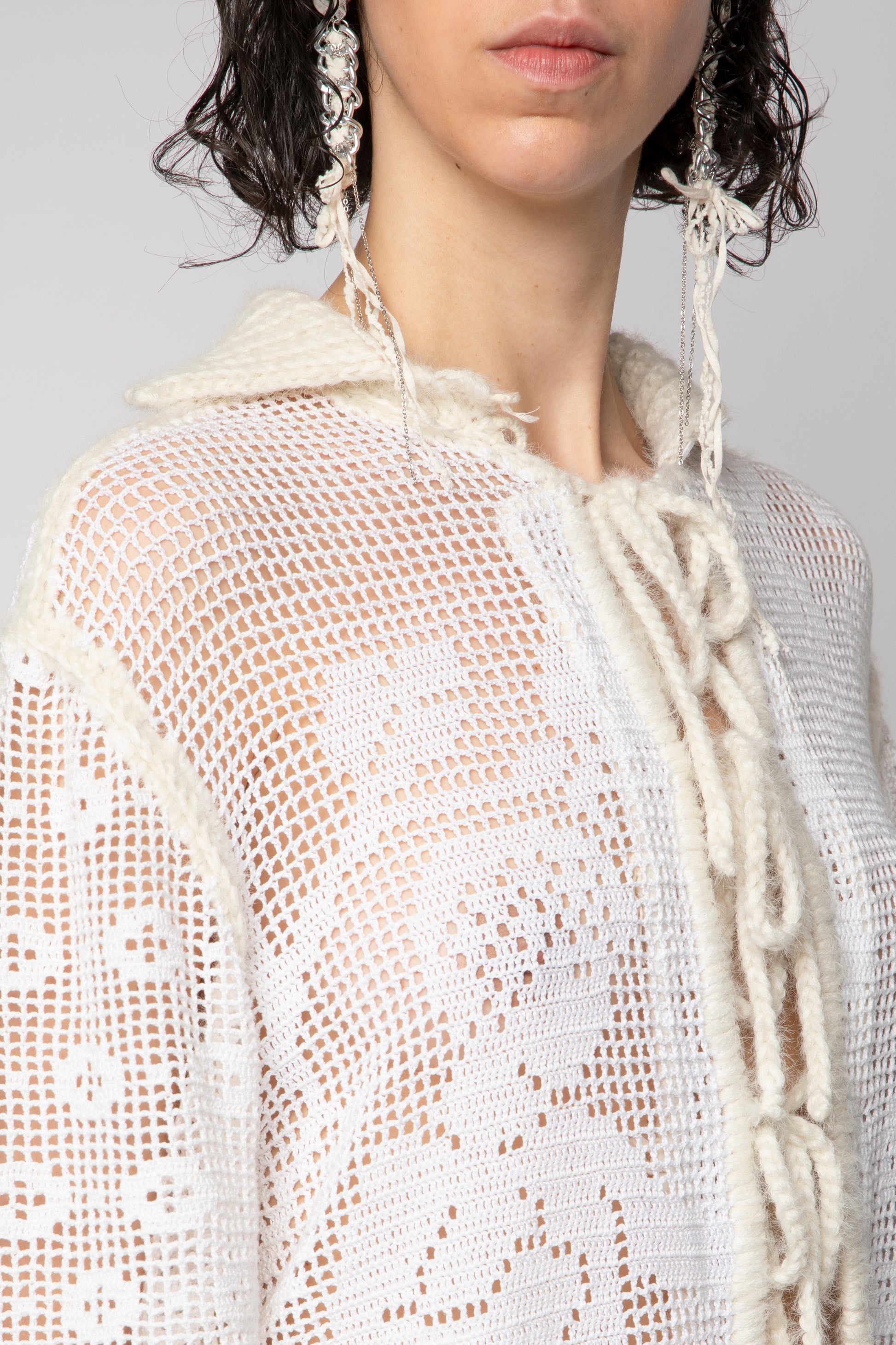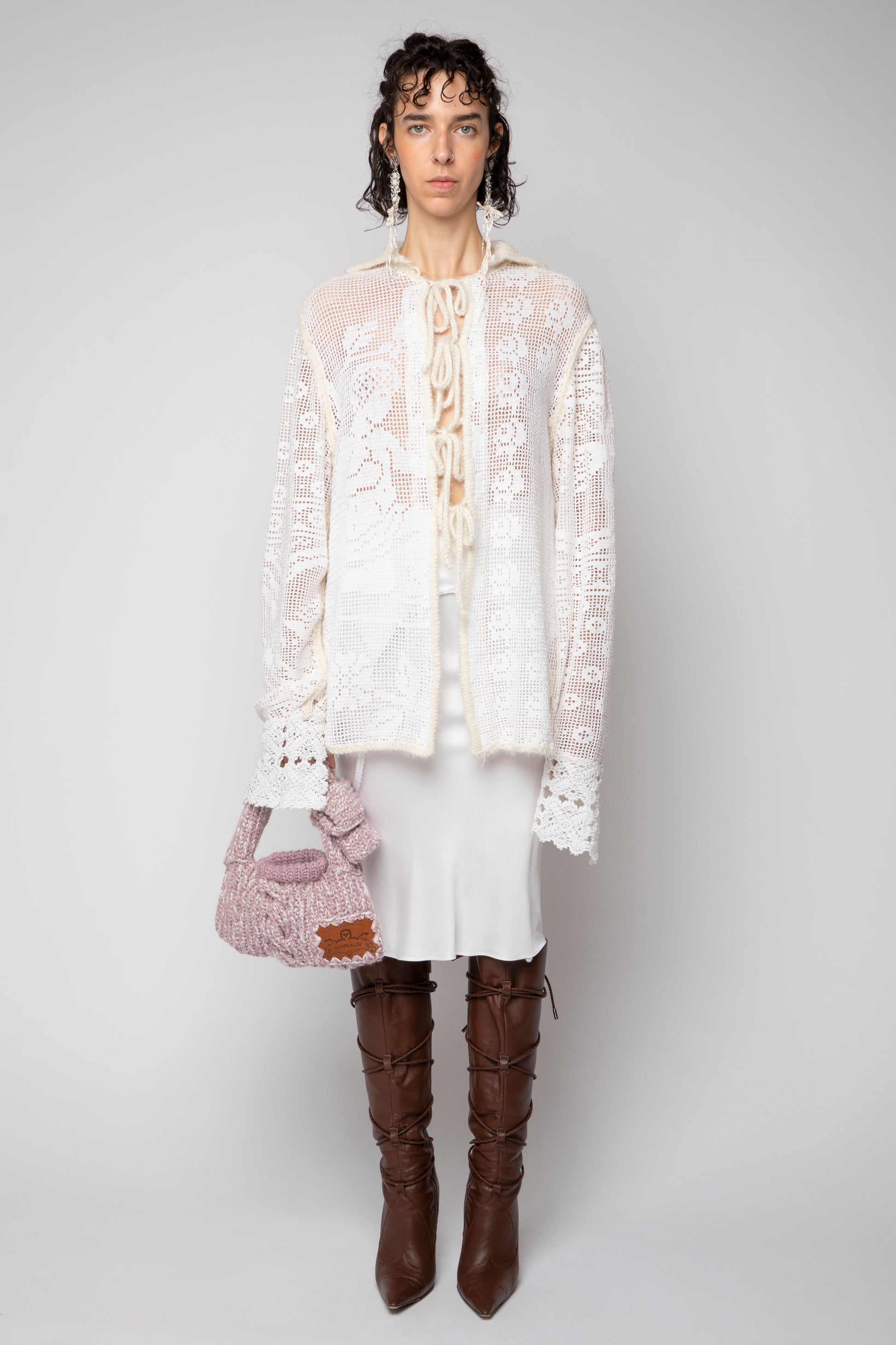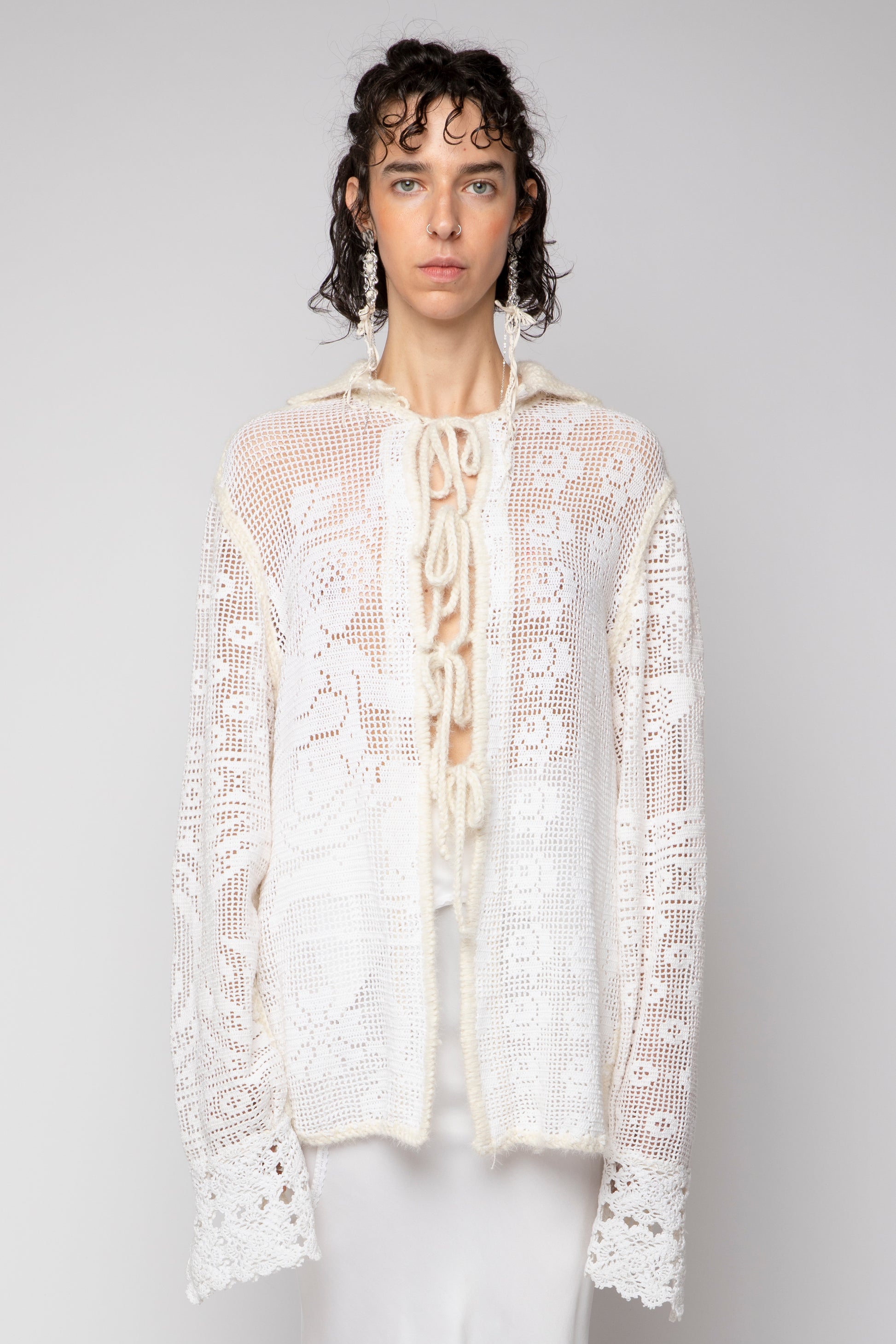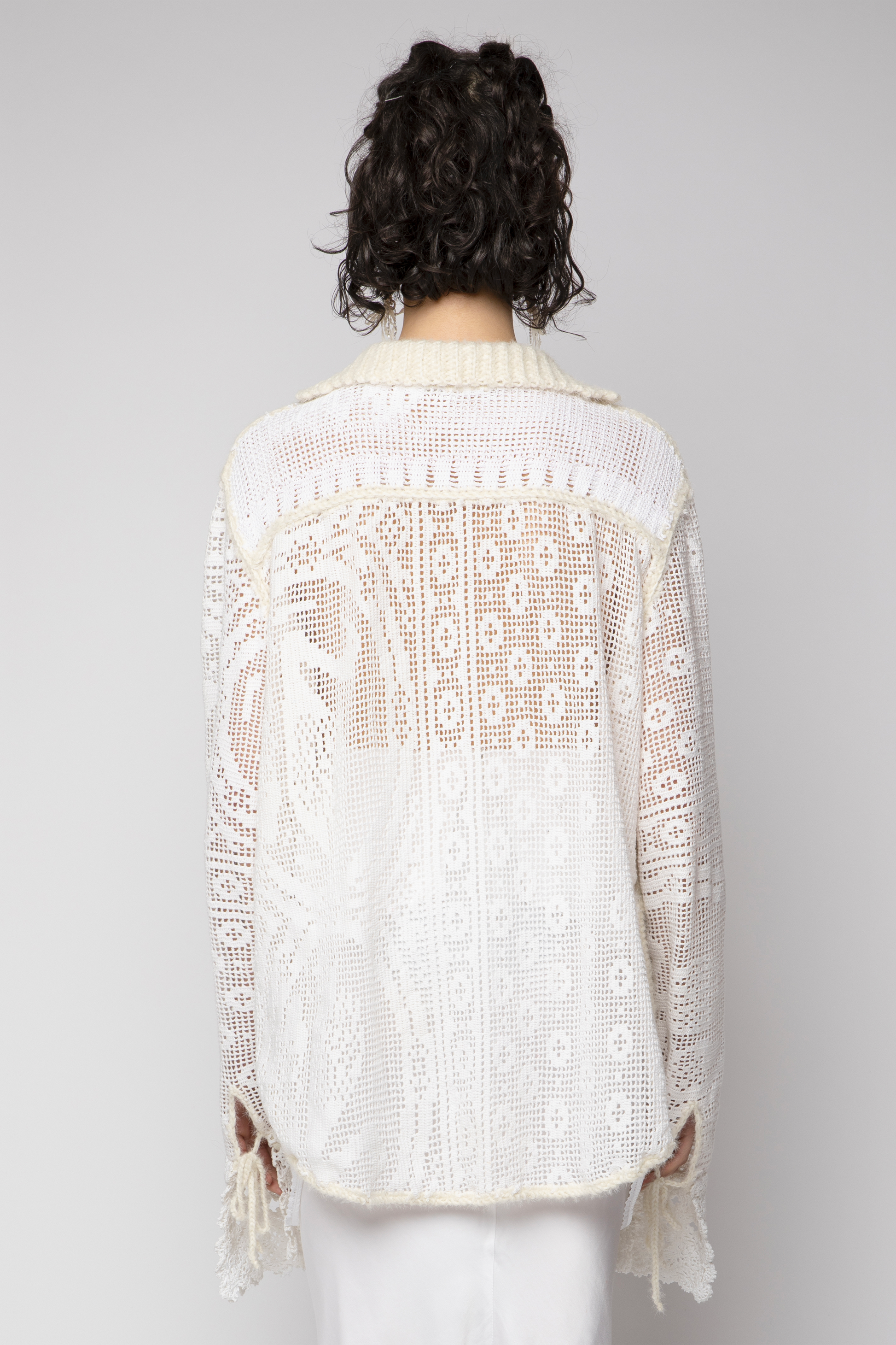 Camicia realizzata in upcycling da centrini all'uncinetto con fili di cotone, colletto e bordature in misto lana.