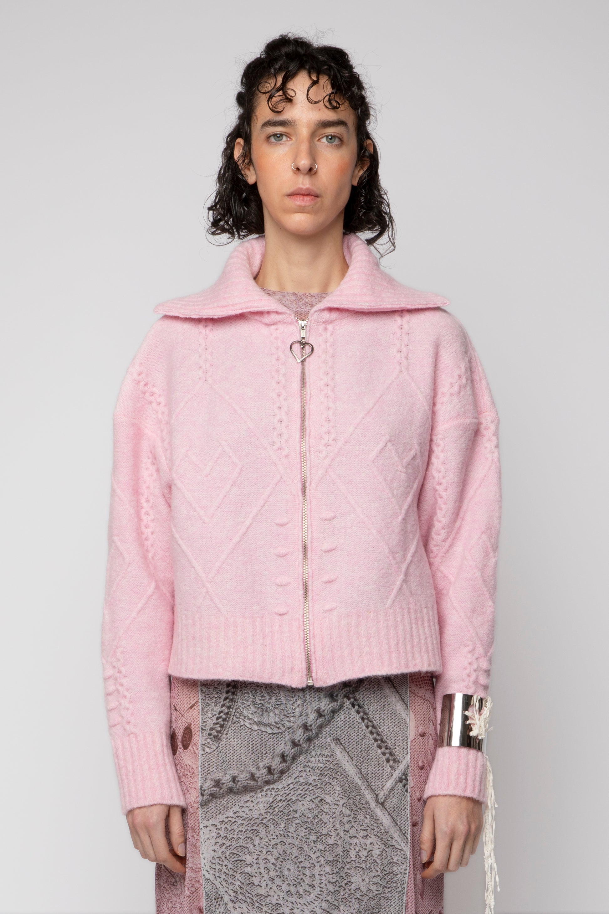 Chiusura frontale con zip metallica e cursore a forma di cuore. Collo, bordo e polsini sono in maglia a coste per un comfort avvolgente.
