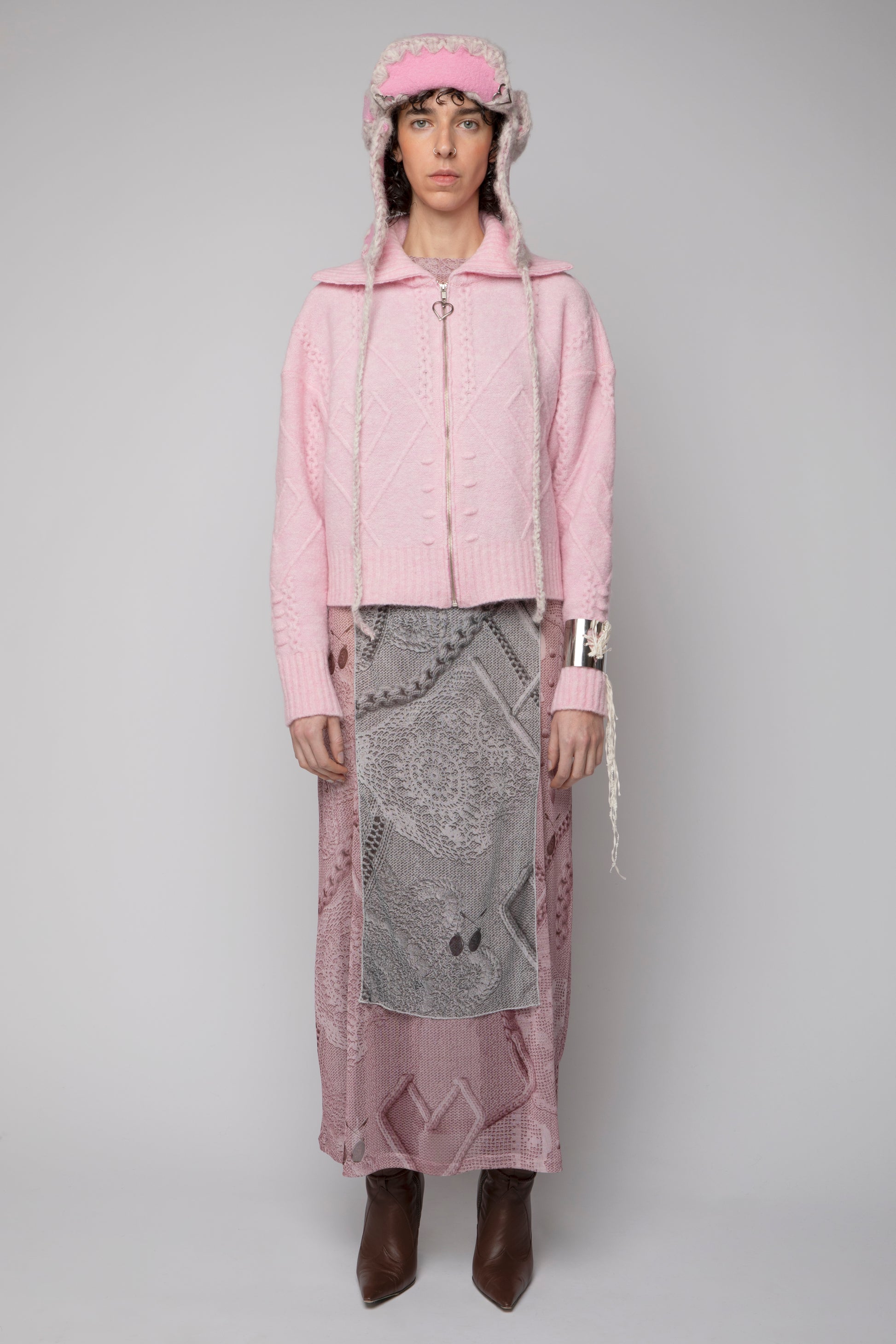 Cardigan Burraco in lana dalla mano soffice e dal peso leggero, pensato per accompagnare con comfort e calore. Lavorato con motivo Aran, la cui tradizione attribuisce a trecce e punti significati simbolici tramandati di generazione in generazione.