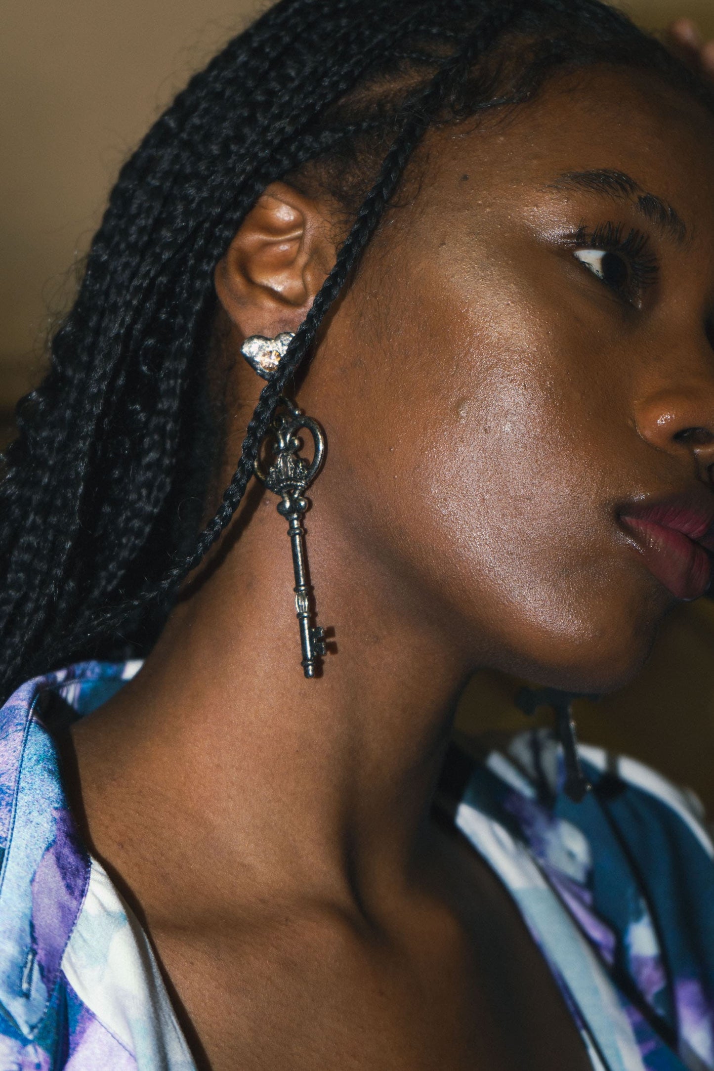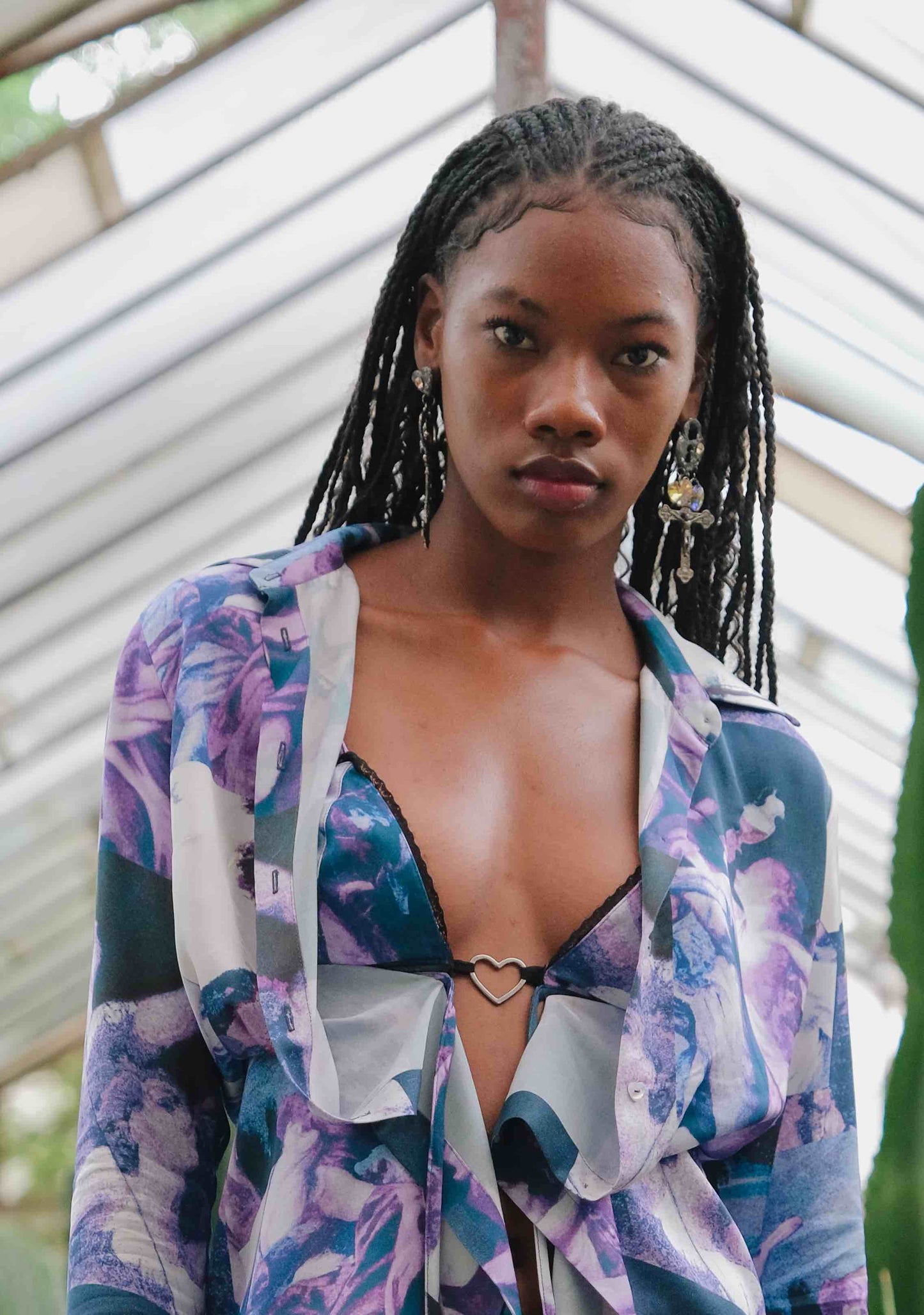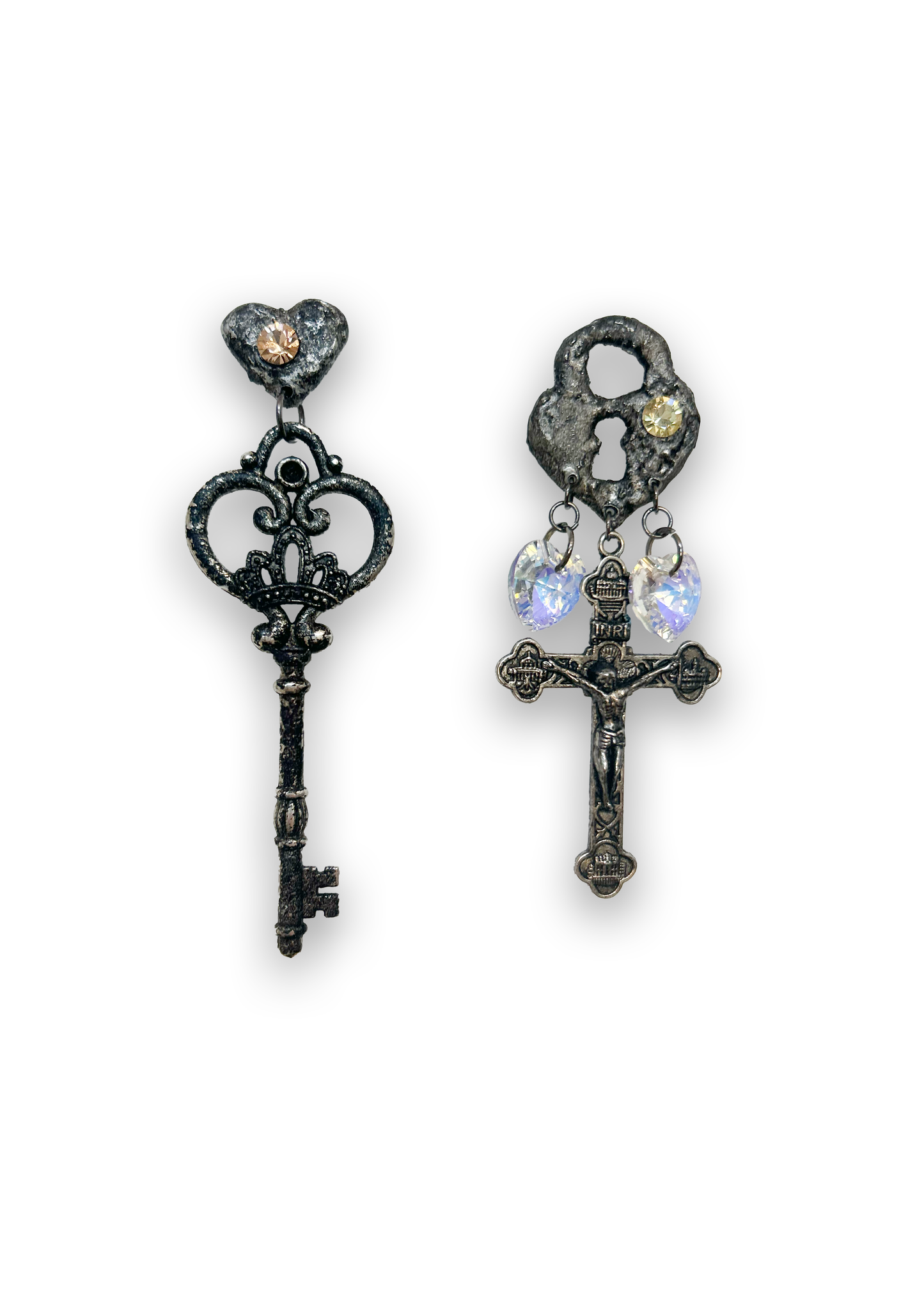 Orecchini pendenti con charms croce e chiave in metallo argentato. Sfilata SS24.