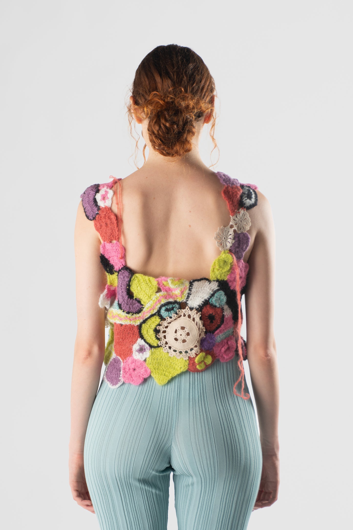 Top patch di uncinetti fatti a mano con fili riciclati multicolor.